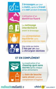 - Brossage régulier des dentsLes dents sont des organes de la bouche, constitués des tissus les plus minéralisés du corps humain. Chez l’homme deux générations de dents se succèdent : les dents de laits et les dents définitives. Elles permettent la mastication : première étape de la digestion. Elles sont au nombre de 20 pour les dents de lait et 32 pour les dents définitives. (cf aussi dents de lait) : Brossez-vous les dentsLes dents sont des organes de la bouche, constitués des tissus les plus minéralisés du corps humain. Chez l’homme deux générations de dents se succèdent : les dents de laits et les dents définitives. Elles permettent la mastication : première étape de la digestion. Elles sont au nombre de 20 pour les dents de lait et 32 pour les dents définitives. (cf aussi dents de lait) au moins deux fois par jour, matin et soir, pendant deux minutes et à la fin de la journée de travail. Utilisez une brosse à dentsManuelle ou électrique elle doit s’adapter à l’âge des enfants. Pour toutes, elles doivent comporter des poils en nylons souples. à poils souples et une pâte dentifriceLe dentifrice est le complément indispensable de la brosse à dents, qui existe sous forme de pâte, de gel ou de comprimés, qui se composent de différents constituant permettant la bonne hygiène bucco-dentaire, l’amélioration de l’haleine. Il peut exister des adjuvants pour des effets complémentaires (contre la gingivite, pour une action blanchissante…). Le fluor est l’élément indispensable pour prévenir la carie dentaire fluorée.