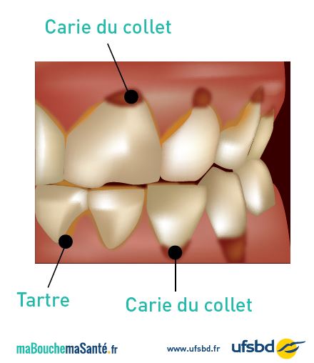 - On parle spécifiquement de carieLa carie se forme avec la destruction progressive de la dent, par déminéralisation de l’émail et attaque de la dentine. Elle se développe toujours de l’extérieur vers l’intérieur de la dent. La carie est une maladie infectieuse d’origine bactérienne qui détruit progressivement la dent. Les bactéries contenues dans la plaque dentaire synthétisent des acides à partir des sucres de l’alimentation, ces acides vont déminéraliser la dent, 1ère étape de la maladie carieuse du boulanger-pâtissier située typiquement au niveau du colletLe collet est situé entre la couronne et la racine de la dent. La couronne est la partie visible, la racine est enfouie dans l’os sous la gencive. Lorsque le début de la racine est exposée dans cette zone de collet il peut être le siège d’hypersensibilité au froid et au sucré. Le collet est aussi la zone ou la gencive est attachée à la dent par l’attache épithéliale. Lorsque cette attache d’affaiblie la gencive se déplace sur la racine on parle de déchaussement (maladie parodontale). des dentsLes dents sont des organes de la bouche, constitués des tissus les plus minéralisés du corps humain. Chez l’homme deux générations de dents se succèdent : les dents de laits et les dents définitives. Elles permettent la mastication : première étape de la digestion. Elles sont au nombre de 20 pour les dents de lait et 32 pour les dents définitives. (cf aussi dents de lait). Ces professions nécessitent une attention particulière d’hygiène de vie, des contrôles et des recommandations spécifiques.